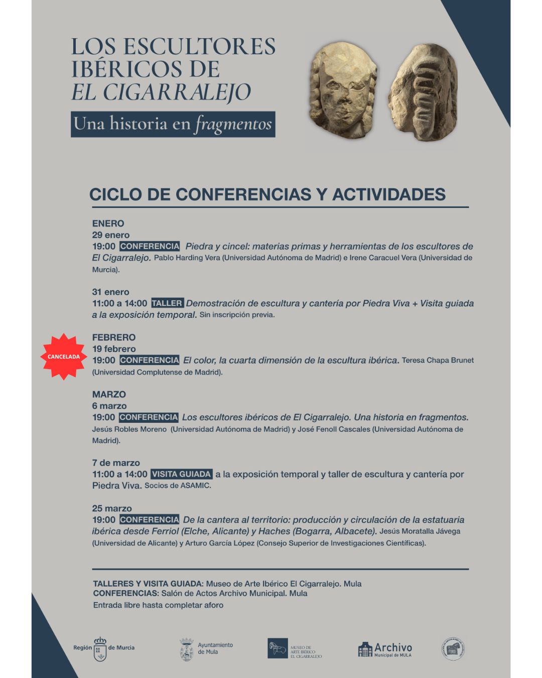 Les informamos que la conferencia del Ciclo "Los escultores ibéricos de El Cigarralejo" prevista para este jueves 19 de febrero queda CANCELADA por causas ajenas a la organización.