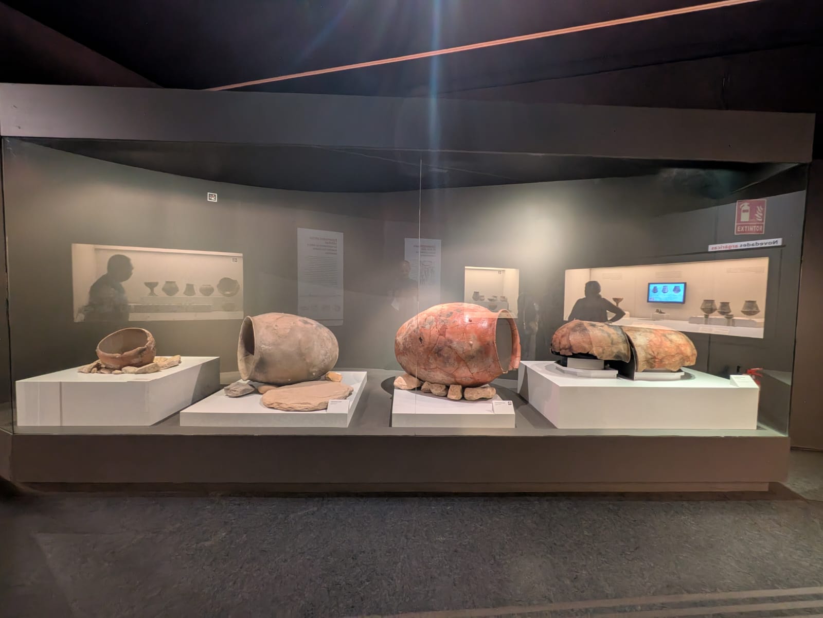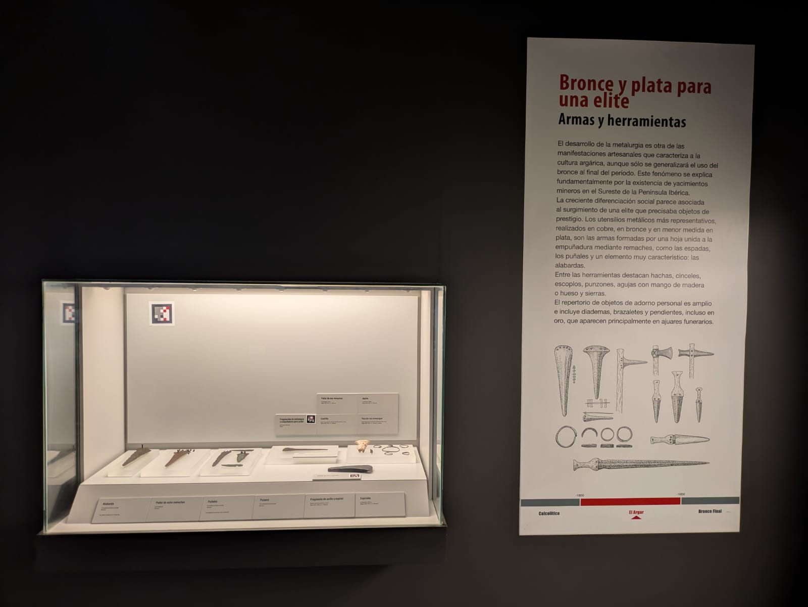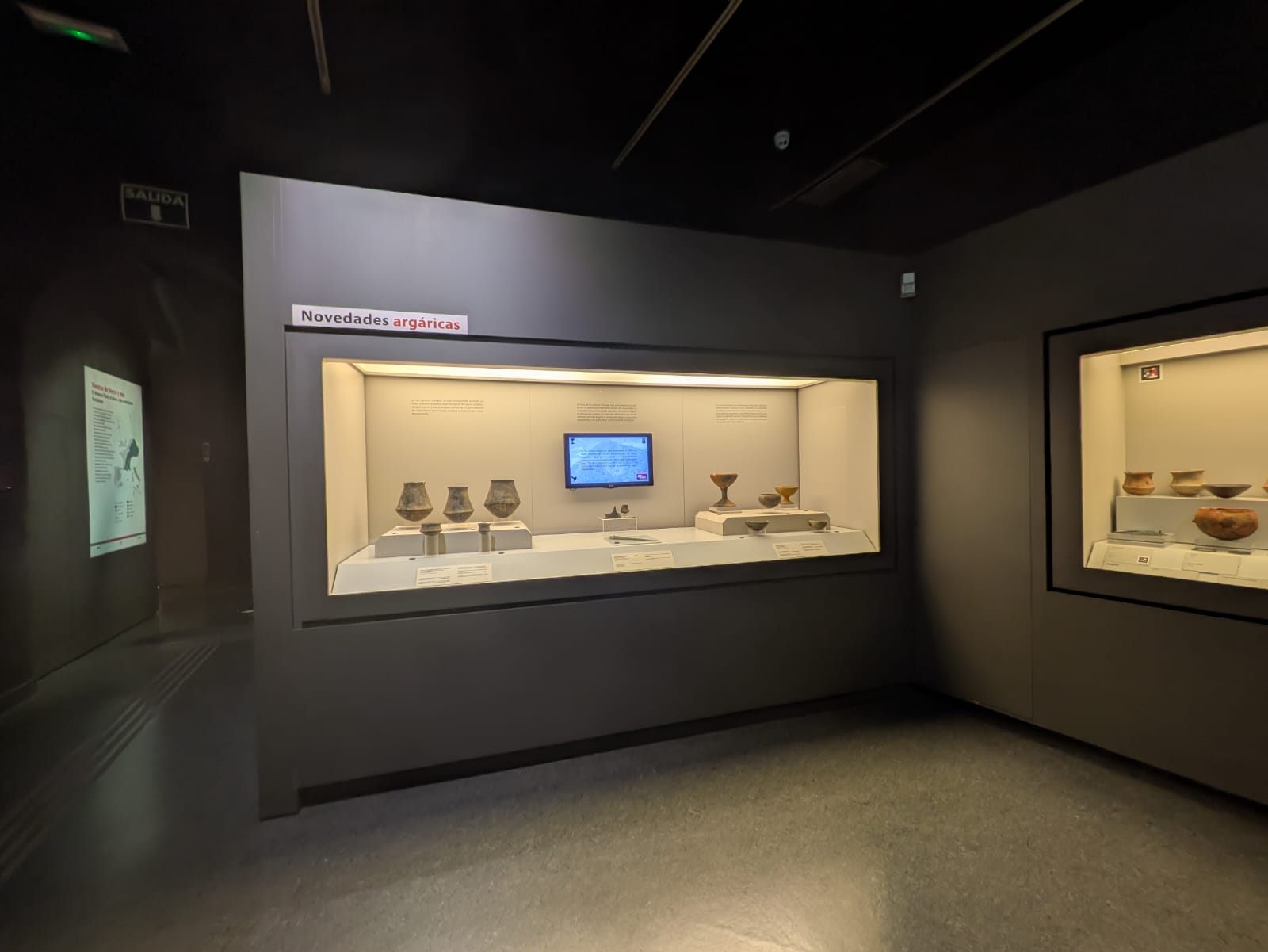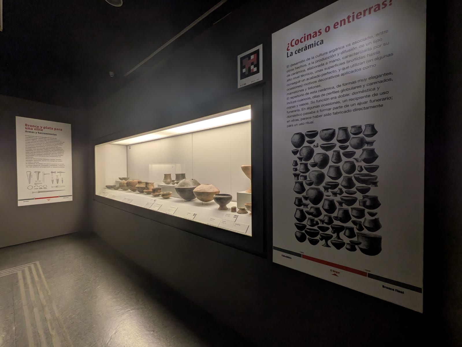 En la vitrina 2, se exponen una serie de materiales cerámicos de gran calidad entre los que cabe destacar los vasos carenados de La Bastida (Totana) y Monteagudo, la copa de Cabezo Negro (Lorca) o el vaso lenticular de Cabeza Gorda (Totana). En la siguiente vitrina, materiales metálicos explican la proliferación y generalización del uso de metales como el cobre, el bronce y la plata para la realización de útiles, armas y adornos, siendo muy significativos la espada de la Cabeza Gorda (Totana) o el puñal de ocho remaches de Monteagudo.