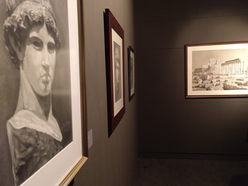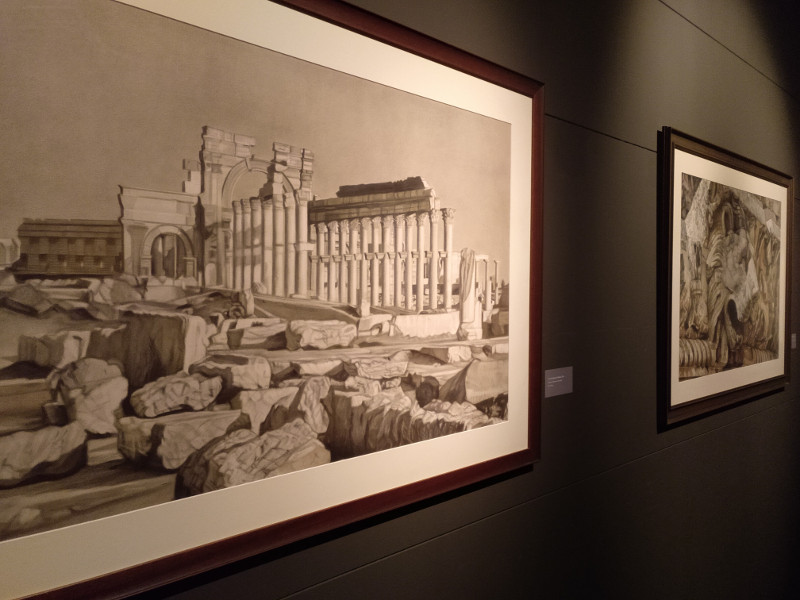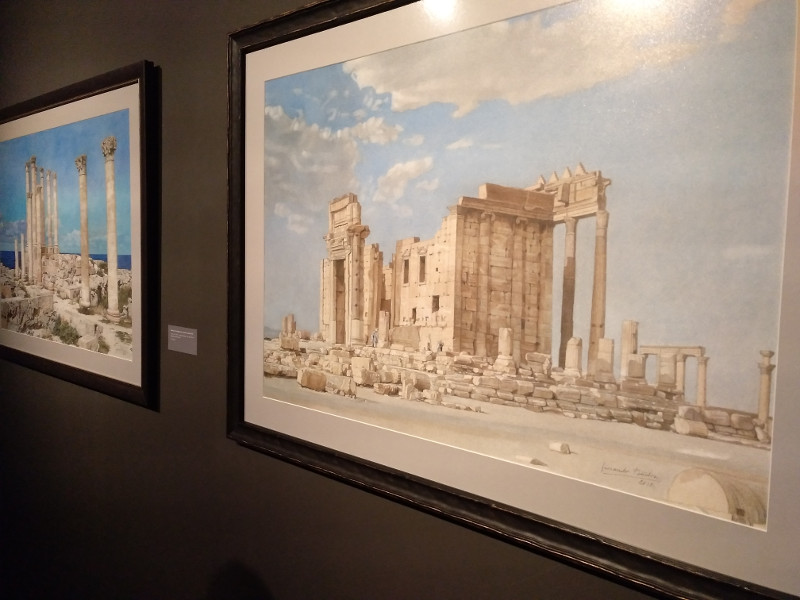 También podremos ver dibujos anteriores a su destrucción por el vandalismo como el Arco triunfal de Palmira (destruido en 2017) o las ruinas del Templo de Bel, en Palmira (destruido en 2015); y otros como las ruinas del templo de Isis, sumergidas en el S. III por las aguas del Mediterráneo.