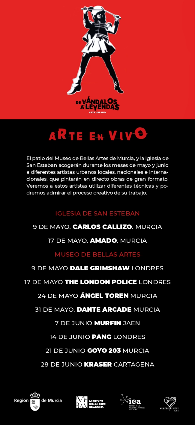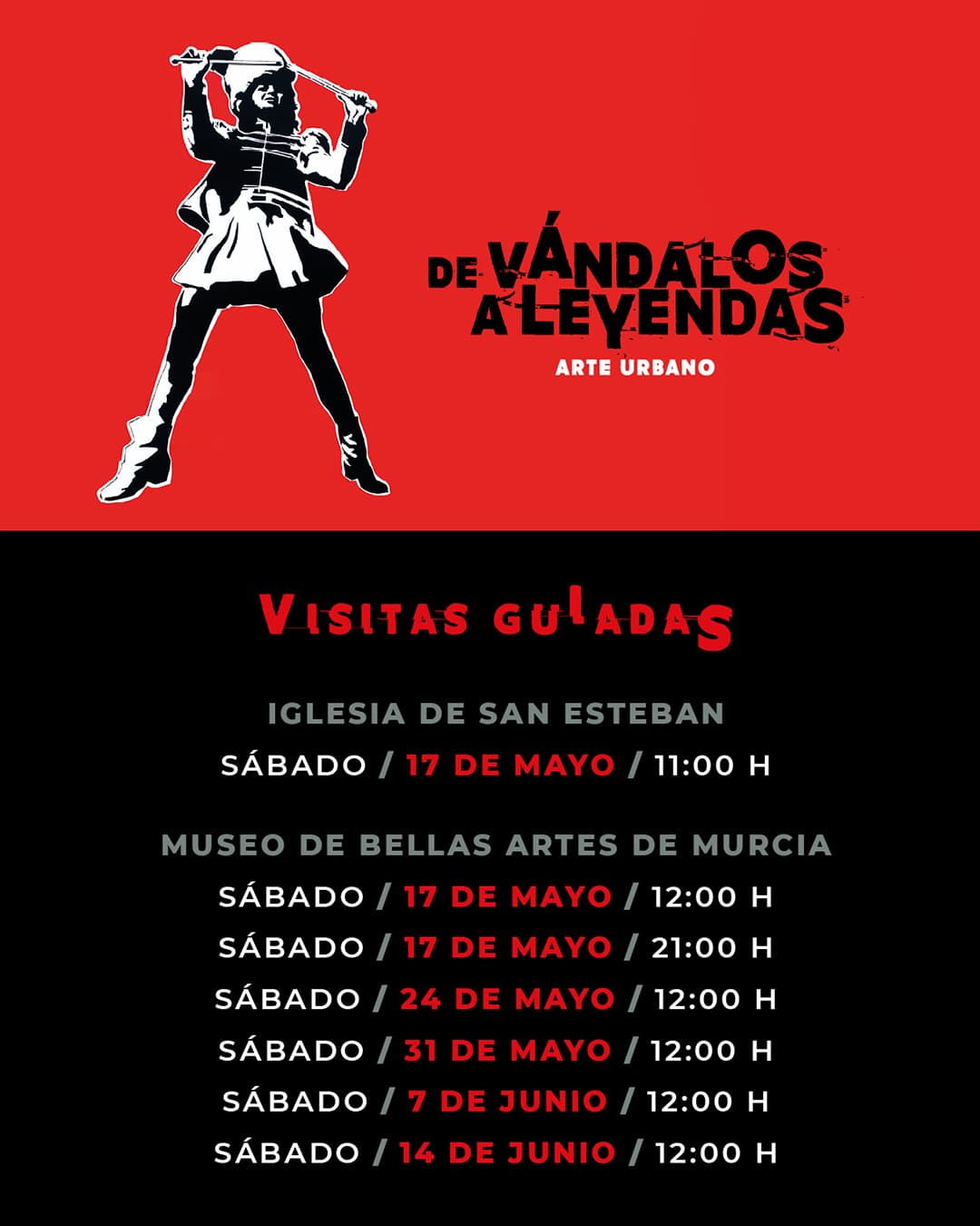 'De vándalos a leyendas. arte urbano' reúne más de cien piezas de creadores como Banksy, Obey o Cope2, Futura 2000, Blek Le Rat, Os Gemeos, Vhils, Aboudia, Retna, Bordalo II, Dran o Invader y puede visitarse en la sala de exposiciones del Palacio de San Esteban y en el Museo de Bellas Artes de Murcia (Mubam).