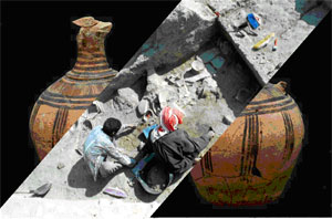 De esta manera encontramos a una anciana moliendo trigo en un primitivo molino de mano, a una niña transportando ramas para el hogar, o las construcciones de adobe de formas curvas que se confunden con el fondo del paisaje. La arqueología también se descubre en ese recorrido visual y circular. Así el sarcófago antropomorfo de Tell Jamîs, que en su interior, próximos a las manos de la muerta, tenía dos alabastrones para contener bálsamos nos evoca la escena bíblica en que María Magdalena vierte el contenido de un frasco semejante sobre el cuerpo de Jesús como primer acto de una muerte irremediable.