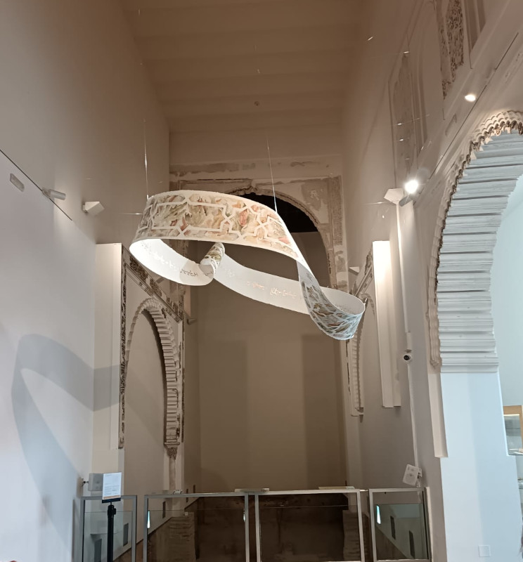 Suspendida en el aire de la sala Sharq al-Andalus, la segunda pieza, 'Moebius', se inspira en los principios matemáticos de la topología y en las bases filosóficas sufíes del místico murciano Ibn ¿Arab¿. A modo de bóveda o banda infinita, la obra rinde homenaje a la Banda de Moebius, símbolo del tiempo sin principio ni fin, evocando a la vez los elementos decorativos del Alcázar Menor y las ideas de unidad y eternidad que subyacen en el pensamiento islámico.