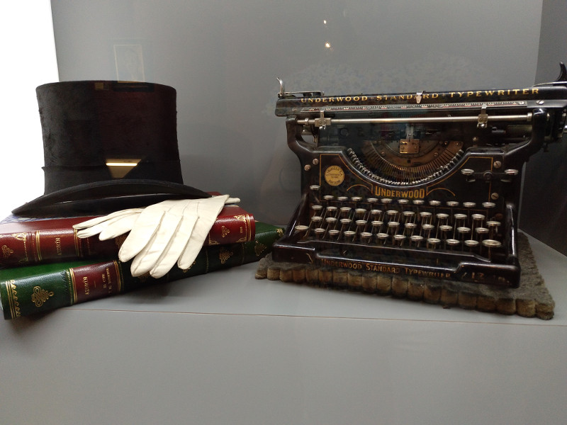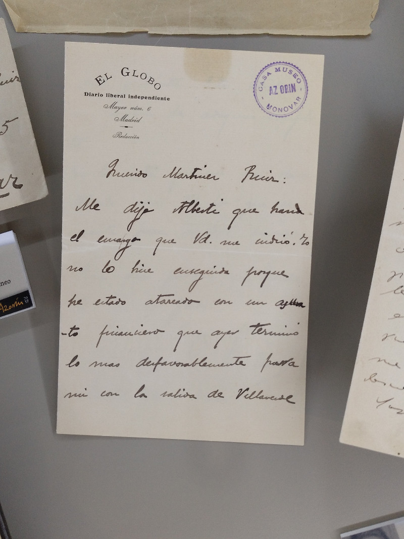Posteriormente, cartas, fotografías, libros y periódicos acompañan el recorrido por su pensamiento, su forma de ser y de escribir, destacando algunos objetos personales como su máquina de escribir. Se presentan obras de pintores como Sorolla, Carlos de Haes, Aureliano de Beruete, Adelardo Parrilla y Benjamín Palencia que, junto a los textos de Azorín, muestran su característica visión del paisaje. Se aborda por último su ‘clasicismo moderno’, los géneros que trabajó y sus intereses, exhibiéndose una antología de textos azorinianos.