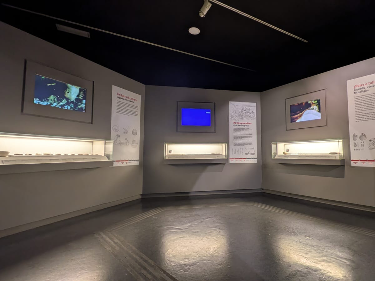 Los avances tecnológicos permitieron a las sociedades prehistóricas una mayor adaptación al medio y una paulatina mejora de sus condiciones de vida. En la sala, tres visuales muestran la realización de utensilios líticos, óseos y cerámicos y una selección de útiles en diferentes procesos de realización y con distinto grado de complejidad, recalcan el concepto de evolución.