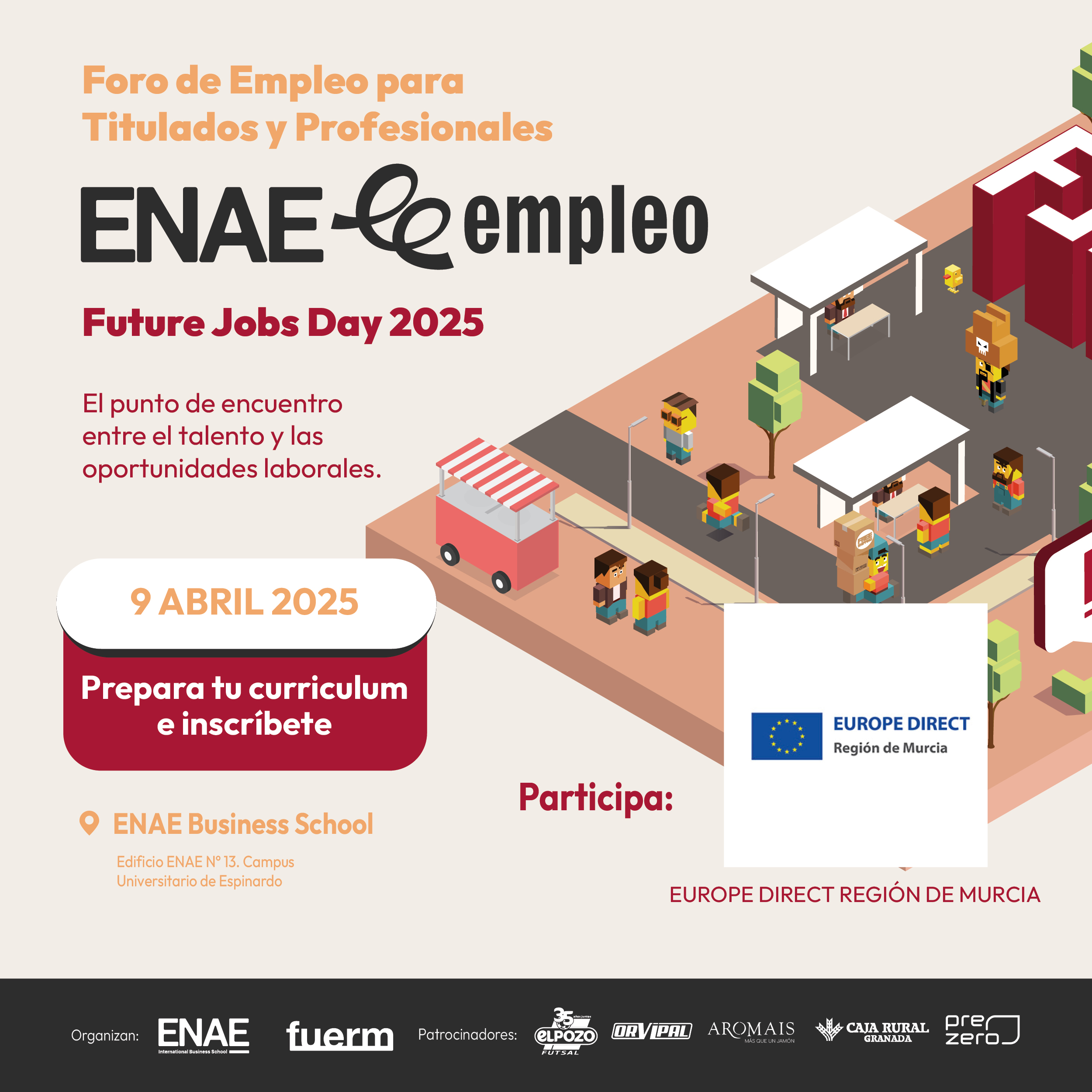 El ENAE Future Jobs Day es mucho más que una feria de empleo: es un laboratorio profesional para conectar talento con oportunidades, aprender de expertos, mejorar tu empleabilidad y sumergirte en un entorno activo y dinámico en la Universidad de Murcia (Espinardo).