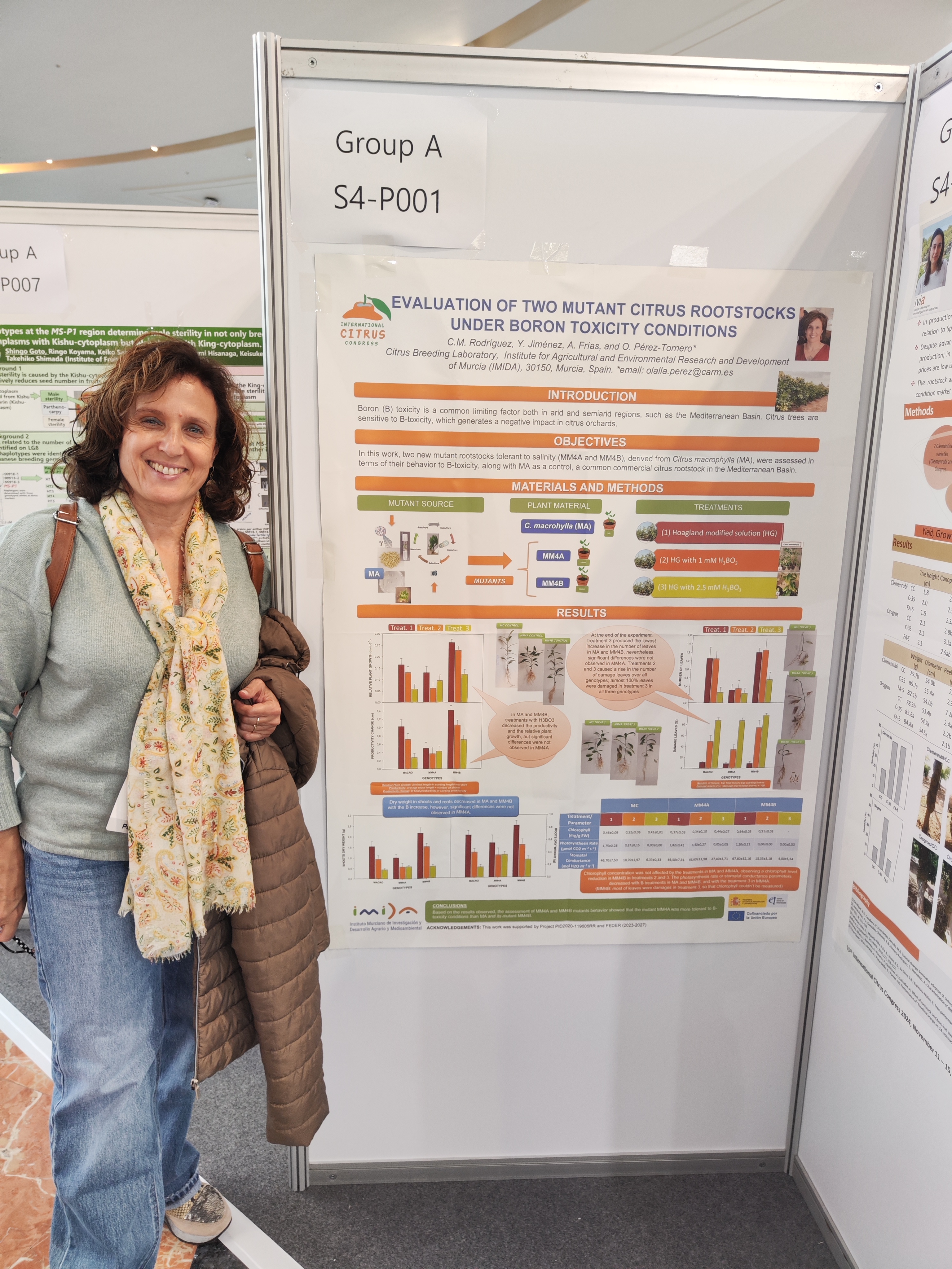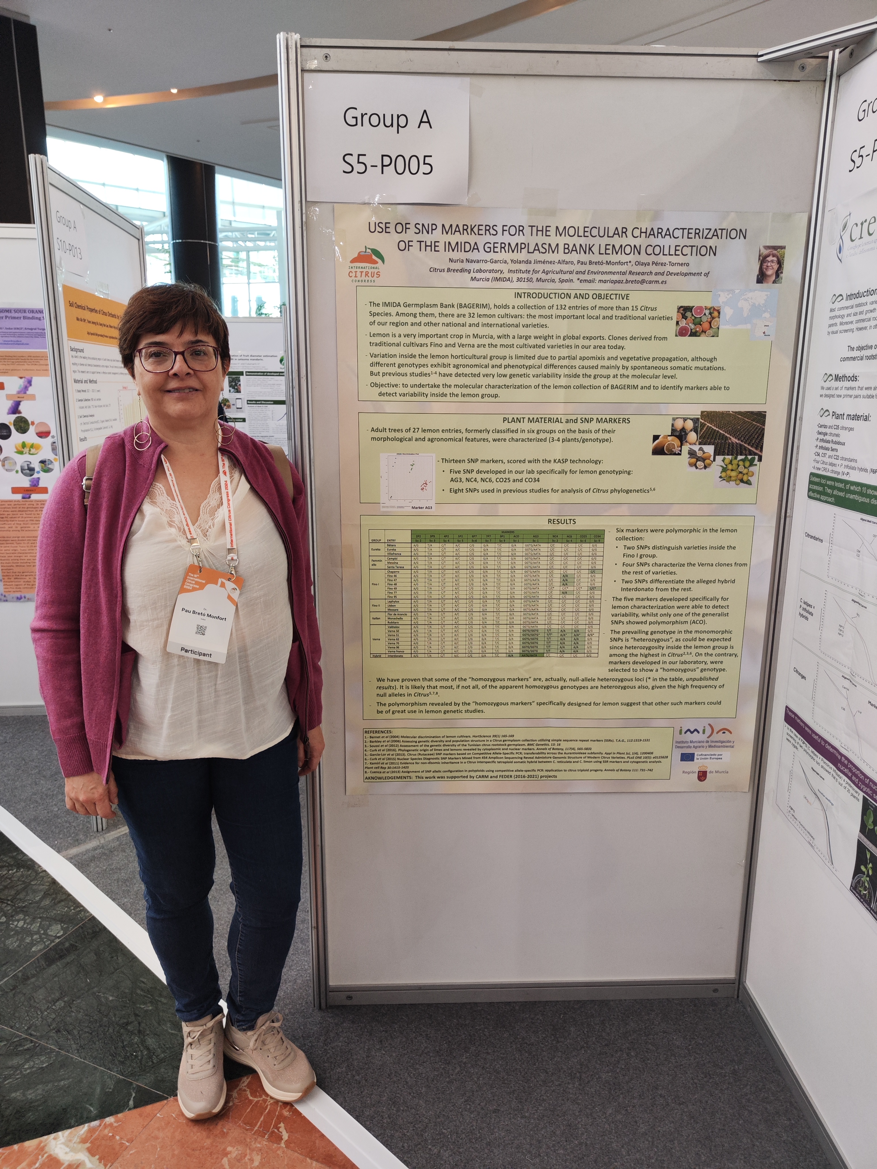 Por parte del IMIDA, han asistido las investigadoras Olaya Pérez y Mª Pau Bretó, que han presentado cuatro trabajos: dos relativos a la caracterización mediante marcadores moleculares de la colección de limonero del BAGERIM y de descendientes del programa de mejora de limón; otro referente a la evaluación de dos nuevos patrones de cítricos a la toxicidad causada por el exceso de Boro; y un cuarto estudio sobre la dependencia de la polinización por insectos en la producción de limonero.