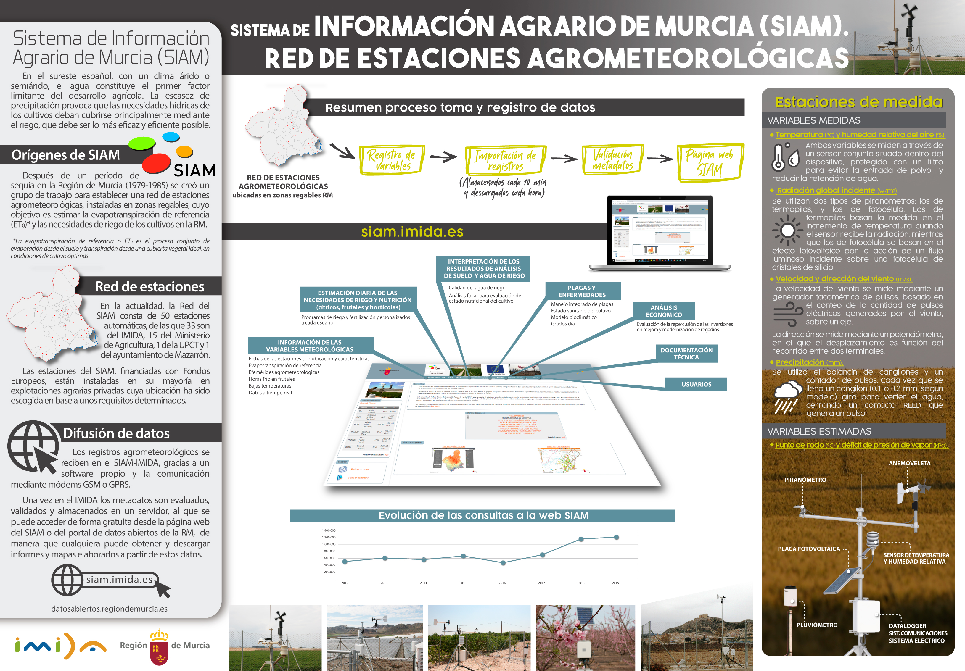 Debido a la vocación divulgadora del Equipo de Agrometeorología en los inicios de la red de estaciones, cuando esta era manual, se emitía un informe semanal que era publicado en las páginas agrícolas de los diarios de tirada regional. Pero desde la transformación a estaciones agrometeorológicas automáticas, de la Red se decidió utilizar métodos más actuales, por lo que en el año 1996 se puso en marcha la primera versión de la página Web SIAM-IMIDA como forma de divulgación de los metadatos e informes generados a partir de ellos de forma diaria. En la actualidad en la tercera versión del SIAM-IMIDA se publican los metadatos registrados por las estaciones cada hora y además, la Región de Murcia, desde la página del SIAM, es la única que cuenta con acceso en tiempo real a los datos de las estaciones agrometeorológicas.